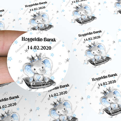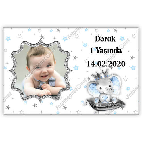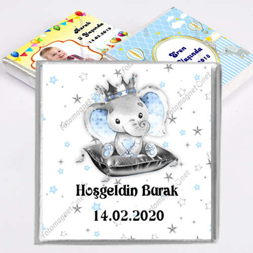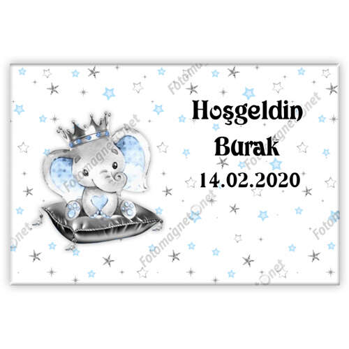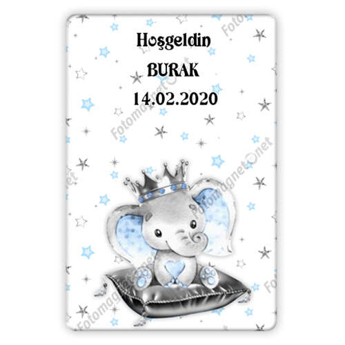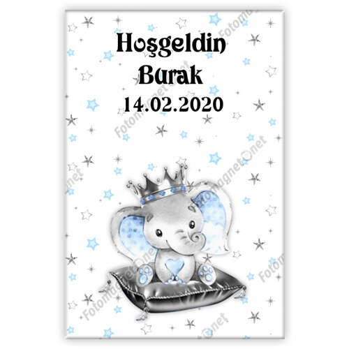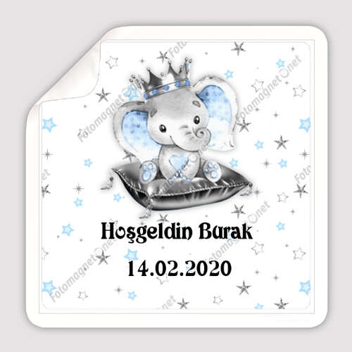 Prens Taçlı Fil Temalı - Kare - Hoş Geldin Bebek - Hatıra - Magnet