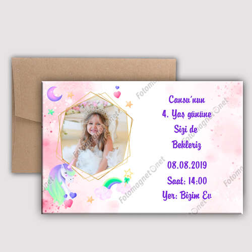 Unicorn Temalı Dore Çerçeveli Zarflı Davetiye