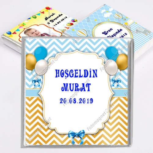 Mavi Dore Balonlu - Hoş Geldin Bebek - Fotoğrafsız - Kare - Hatıra - Magnet