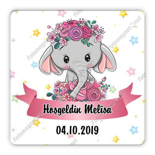 Çiçekli Fil Temalı - Hoş Geldin Bebek - Kare - Magnet