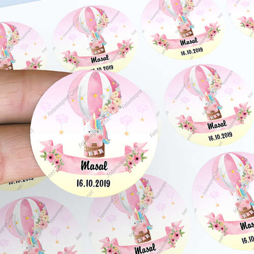 Uçan Balonda Unicorn Temalı - Fotoğraflı - Kare - Etiket -