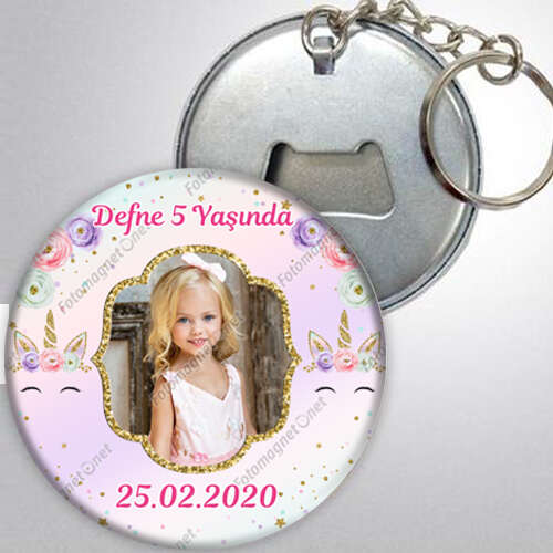 Unicorn Temalı Renkli Çiçekli - Fotoğraflı - Metal - Açacak - Anahtarlık