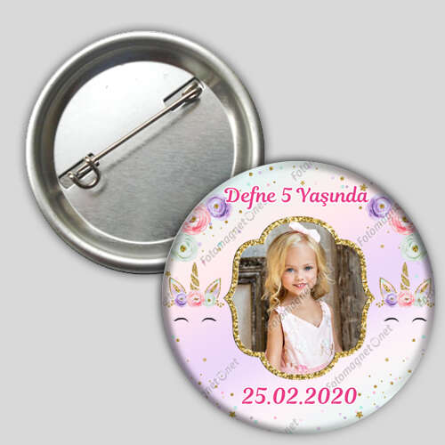 Unicorn Temalı Renkli Çiçekli - Fotoğraflı - İğneli Buton Rozet