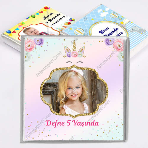 Unicorn Temalı Renkli Çiçekli - Fotoğraflı - Sargılı Çikolata Etiketi