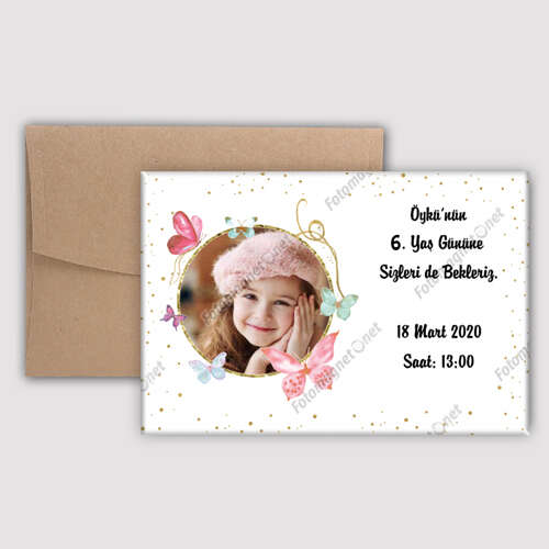 Kelebek Temalı Dore Beyaz Zarflı - Doğum Günü - Davetiyesi