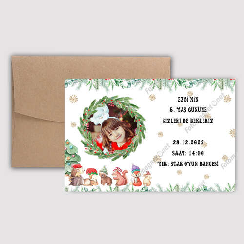 Kış Ve Sevimli Hayvanlar Temalı Zarflı - Doğum Günü Davetiyesi