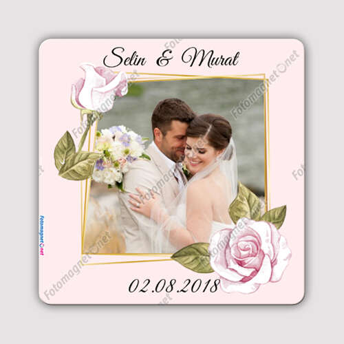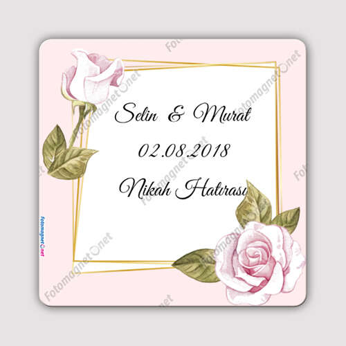 Pembe Gül Temalı - Nişan - Nikah - Fotoğrafsız - Kare - Magnet