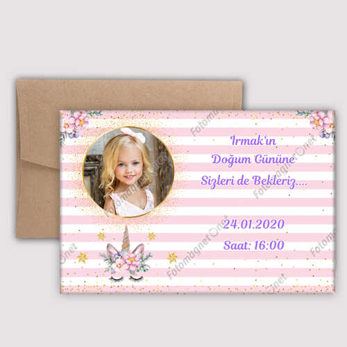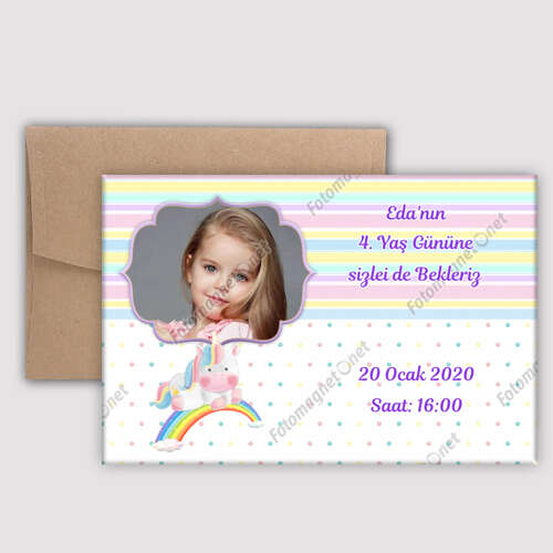 Unicorn Temalı Renkli Zarflı - Doğum Günü Davetiyesi
