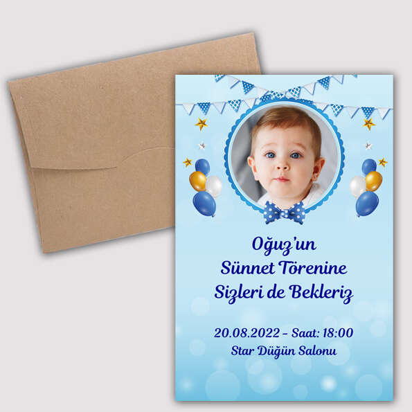 Papyonlu Mavi Dore Balonlu Zarflı Davetiye