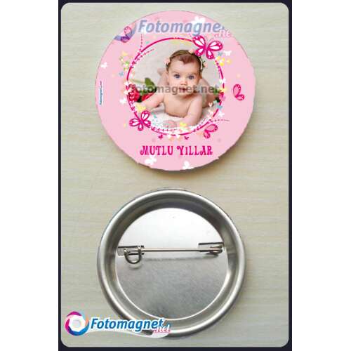 Pembe Kelebek Temalı - Fotoğraflı - İğneli Buton Rozet